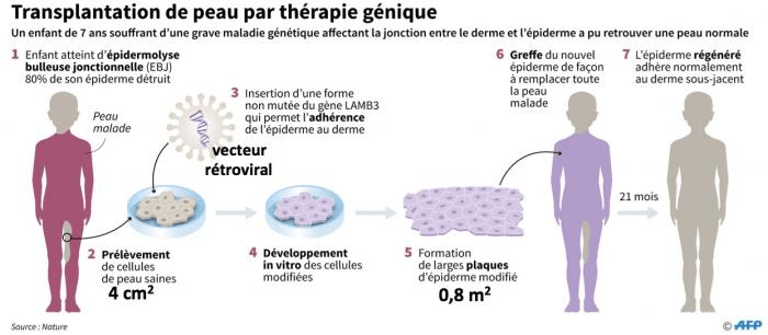 Les chercheurs ont prélevé un échantillon de peau saine du patient, puis ont isolé les cellules souches de l’épiderme. Ces cellules ont été modifiées génétiquement pour stimuler leur capacité de régénération et de différenciation. Ensuite, ces cellules transgéniques ont été cultivées et multipliées en laboratoire pour obtenir une quantité suffisante de cellules régénératrices.
